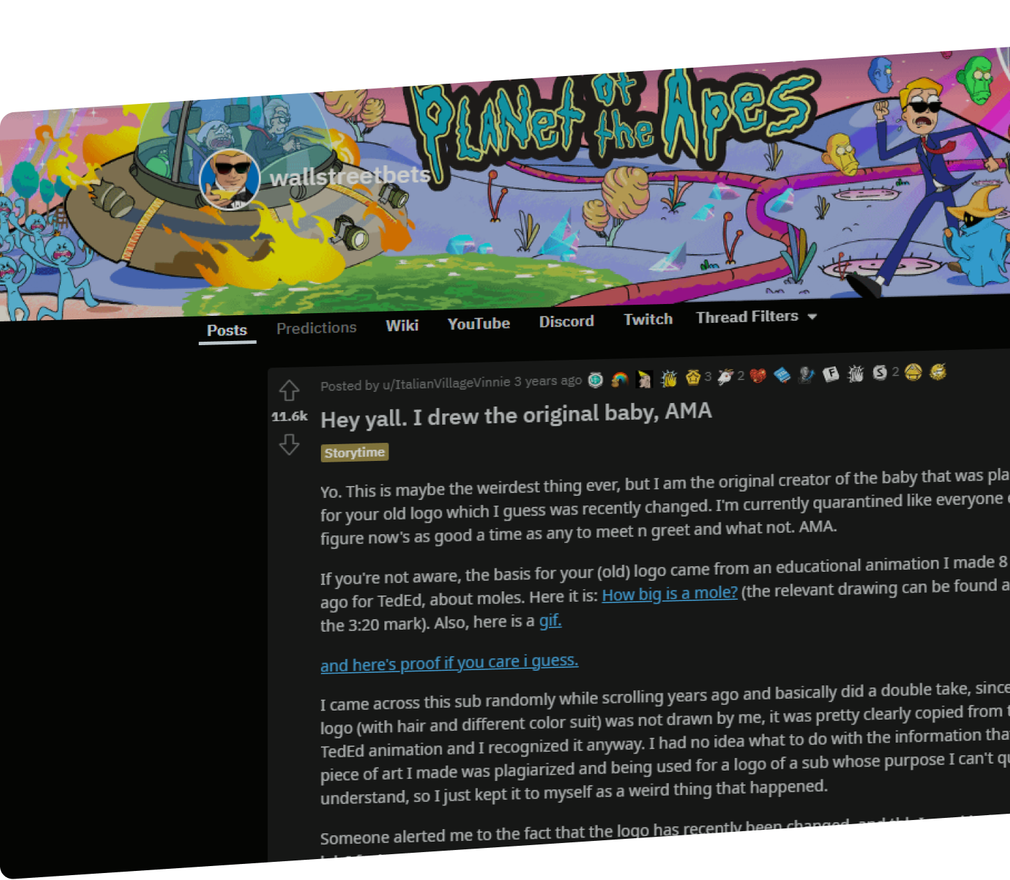 The designer had one question in mind when he created the baby in that video; what would a 2 foot tall modern ape look like? We have reserved 1% of the token supply for this visionary.